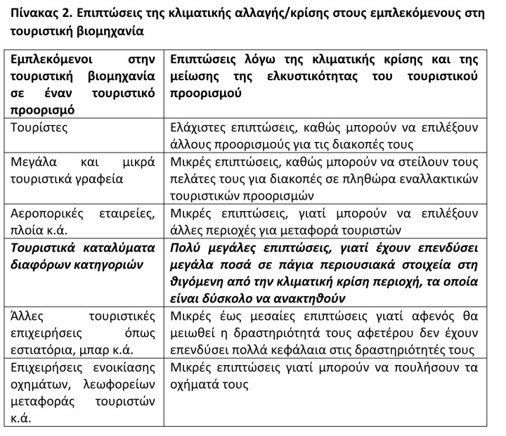 Συνεπώς, η κλιματική αλλαγή είναι πολύ πιθανόν να μειώσει στο μέλλον την ελκυστικότητα των τουριστικών προορισμών της χώρας σε συνδυασμό με τα φαινόμενα υπερτουρισμού που ήδη παρατηρούνται σε πολλές περιοχές. Οι επιπτώσεις όμως στους εμπλεκόμενους στην τουριστική βιομηχανία θα είναι διαφορετικές και άνισες, με περισσότερο θιγόμενα τα τουριστικά καταλύματα.