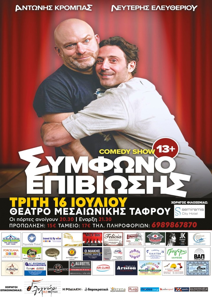 Ο Αντώνης Κρόμπας και ο Λευτέρης Ελευθερίου, το αχτύπητο κωμικό δίδυμο της νέας ελληνικής κωμικής σκηνής έρχεται στη Ρόδο, στο Θέατρο Μεσαιωνικής Τάφρου, με ένα καταπληκτικό comedy show και υπογράφουν «Σύμφωνο Επιβίωσης».