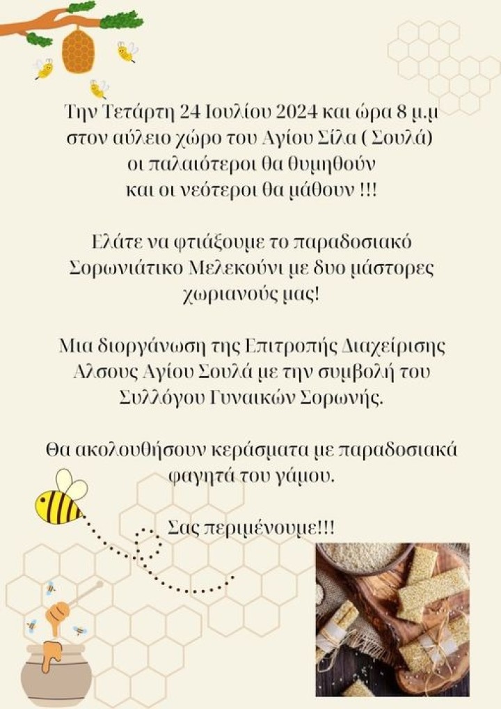 Την εκδήλωση διοργανώνει η Επιτροπή Διαχείρισης Άλσους Αγίου Σουλά με τη συμβολή του Συλλόγου Γυναικών Σορωνής. Στις 9 μ.μ., στον ίδιο χώρο, θα ακουστεί έντεχνη και λαϊκή μουσική από νεανικό μουσικό σχήμα.
