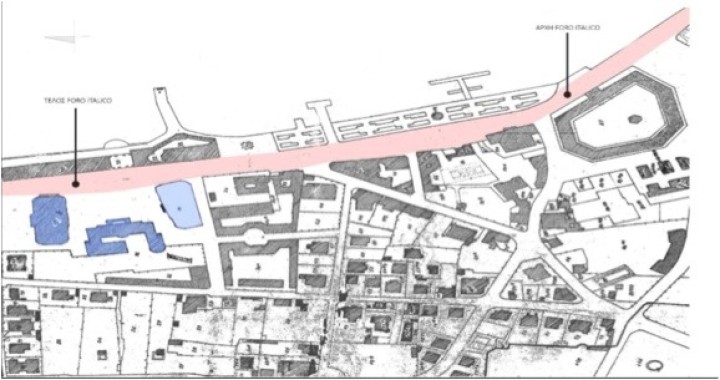 Τα κτήρια που τοποθετούνται στο Foro Italico είναι η νέα αγορά, η τράπεζα της Ιταλίας (σημερινή Τράπεζα της Ελλάδας), η ιταλική Λέσχη (σημερινό Λιμεναρχείο), και σε κεντρική θέση το μέγαρο του φασισμού-Casa del Fascio (σημερινά δικαστήρια).