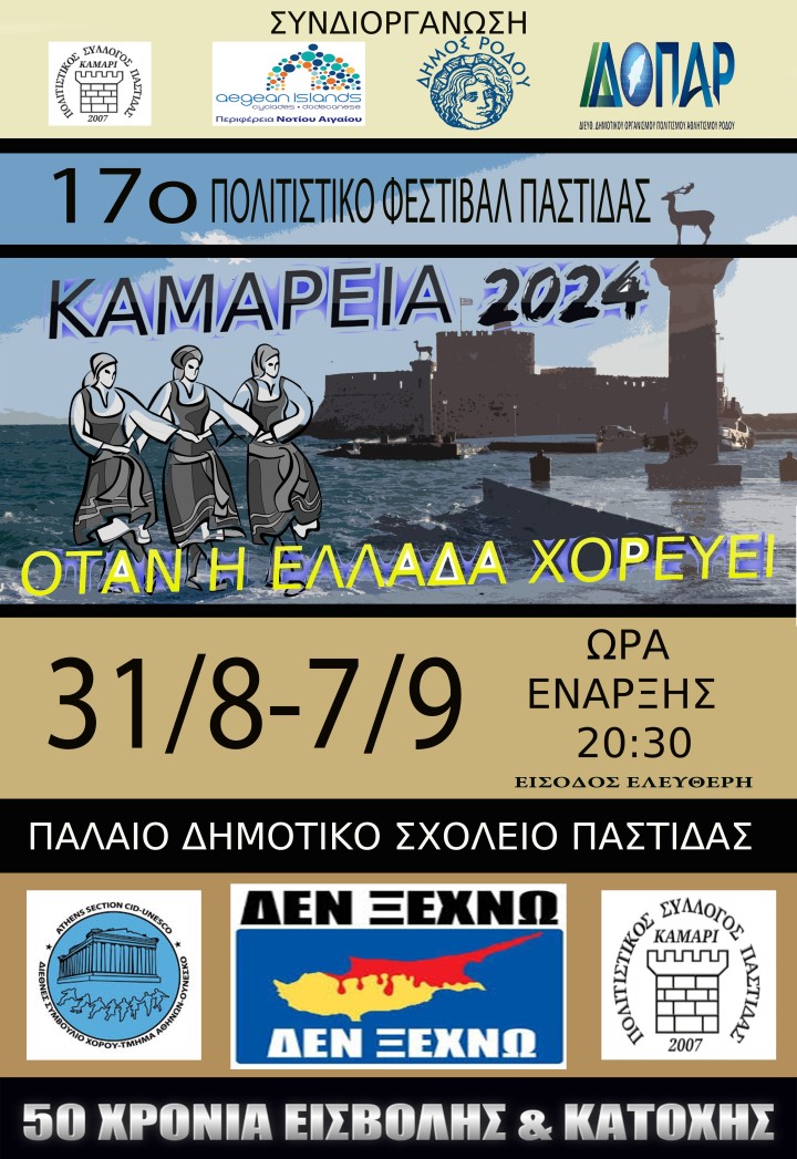 Ο Πολιτιστικός Σύλλογος Παστίδας Ρόδου «Καμάρι» προσκαλεί το κοινό της Ρόδου στο 17ο Πολιτιστικό Φεστιβάλ Παστίδας «Καμάρεια 2024» που συνδιοργανώνει με την περιφέρεια Νοτίου Αιγαίου και τον δήμο Ρόδου - Δ.Ο.Π.Α.Ρ.