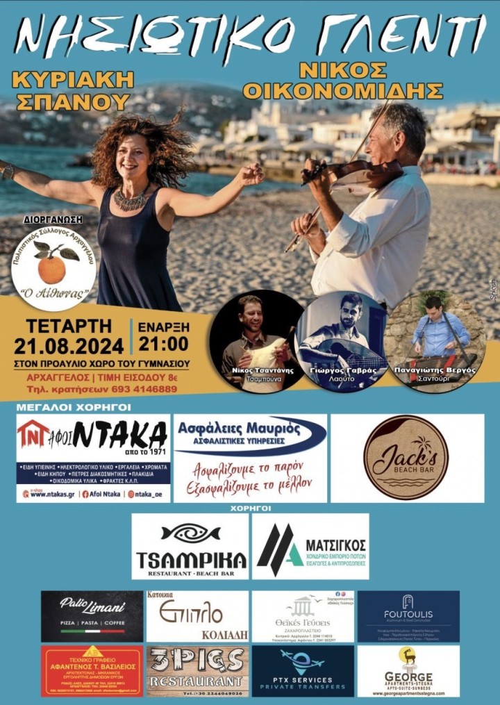 Ο Πολιτιστικός Σύλλογος Αρχαγγέλου «Ο Αίθωνας» προσκαλεί το κοινό της Ρόδου στη μουσική εκδήλωση «ΝΗΣΙΩΤΙΚΟ ΓΛΕΝΤΙ» με τον Νίκο Οικονομίδη και την Κυριακή Σπανού, την Τετάρτη 21 Αυγούστου στις 20.00 στον αύλειο χώρο του Γυμνασίου Αρχαγγέλου. Την εκδήλωση στηρίζει η Δημοτική Κοινότητα Αρχαγγέλου.
