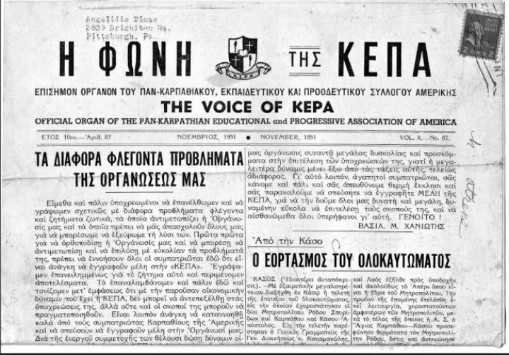 Στις 4 Νοεμβρίου 1928 ιδρύθηκε στο Pittsburgh η Παν-Καρπαθιακή οργάνωση “Karpathian Educational and Progressive Association” γνωστή ως ΚΕΠΑ, με σκοπό την αλληλοβοήθεια των Καρπαθίων της Αμερικής και τη βελτίωση της παιδείας στην Κάρπαθο.