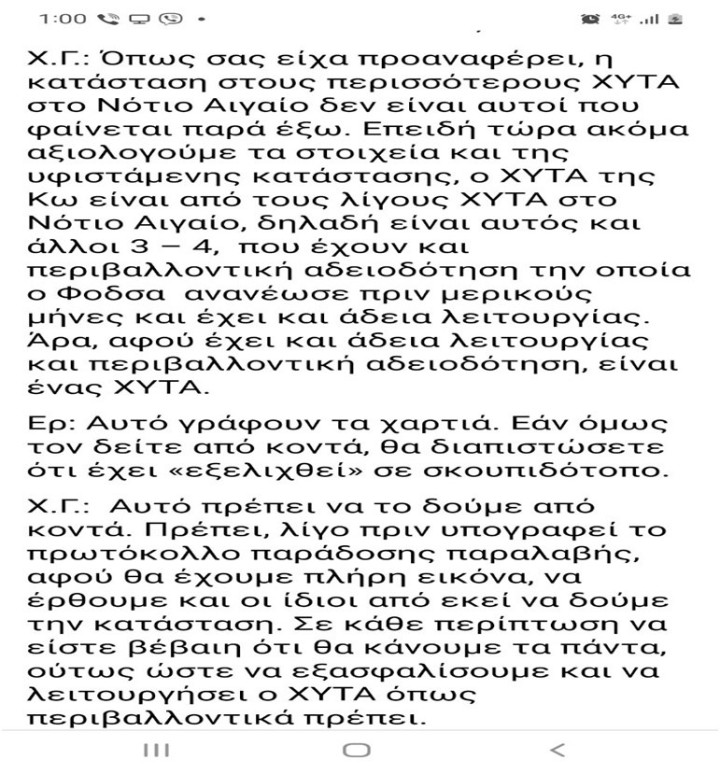 «Χ.Γ.: Όπως σας είχα προαναφέρει, η κατάσταση στους περισσότερους ΧΥΤΑ στο Νότιο Αιγαίο δεν είναι αυτοί που φαίνεται παρά έξω. Επειδή τώρα ακόμα αξιολογούμε τα στοιχεία και της υφιστάμενης κατάστασης, ο ΧΥΤΑ της Κω είναι από τους λίγους ΧΥΤΑ στο Νότιο Αιγαίο, δηλαδή είναι αυτός και άλλοι 3 – 4, που έχουν και περιβαλλοντική αδειοδότηση την οποία ο Φοδσα ανανέωσε πριν μερικούς μήνες και έχει και άδεια λειτουργίας. Άρα, αφού έχει και άδεια λειτουργίας και περιβαλλοντική αδειοδότηση, είναι ένας ΧΥΤΑ.»
