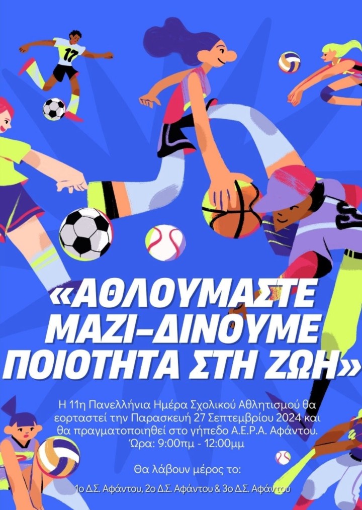 Με αφορμή την 11η Πανελλήνια Ημέρα Σχολικού Αθλητισμού, που γιορτάστηκε την Παρασκευή 27 Σεπτεμβρίου 2024, τα τρία Δημοτικά Σχολεία του Αφάντου πραγματοποίησαν με τη στήριξη της Δ.Ε. Αφάντου στο Δημοτικό Γήπεδο Αφάντου την αθλητική δράση «Αθλούμαστε μαζί – Δίνουμε ποιότητα στη ζωή».
