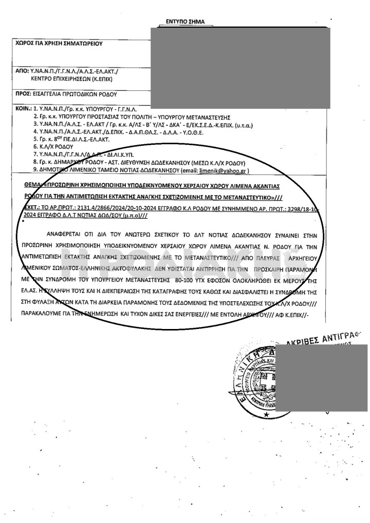 Το έγγραφο αυτό, έφθασε στα χέρια του δημάρχου Ρόδου, το βράδυ της Κυριακής. Όπως προκύπτει από το περιεχόμενό του, δίνεται σχετική έγκριση για την άμεση μεταφορά στον χώρο αυτό για 80 – 100 άτομα, αφού όμως προηγουμένως ταυτοποιηθούν.
