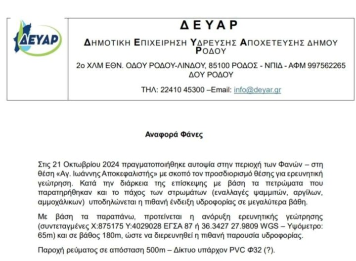 Μετά τον έλεγχο και τη σχετική έρευνα που έγινε από τα εξειδικευμένα στελέχη της ΔΕΥΑΡ, αποφάσισαν να δώσουν το «πράσινο φως» για να προχωρήσει το έργο στην περιοχή του Αγ. Ιωάννη στις Φάνες. Ένα έργο, που όπως επισήμανε στη «Ροδιακή» ο πρώην πρόεδρος των Φανών, κ. Βασίλης Νικολίτσης, είναι άκρως απαραίτητο για την ομαλή υδροδότηση των Φανών. Σε δήλωσή του, ο κ. Βασίλης Νικολίτσης, ευχαριστεί δημόσια τον Δήμαρχο Ρόδου κο Αλέξανδρο Κολιάδη και τον πρόεδρο της ΔΕΥΑΡ κο Σωτήρη Βαγιανό για την άμεση ανταπόκρισή τους, στο σχετικό αίτημα που εδώ και καιρό είχε καταθέσει.