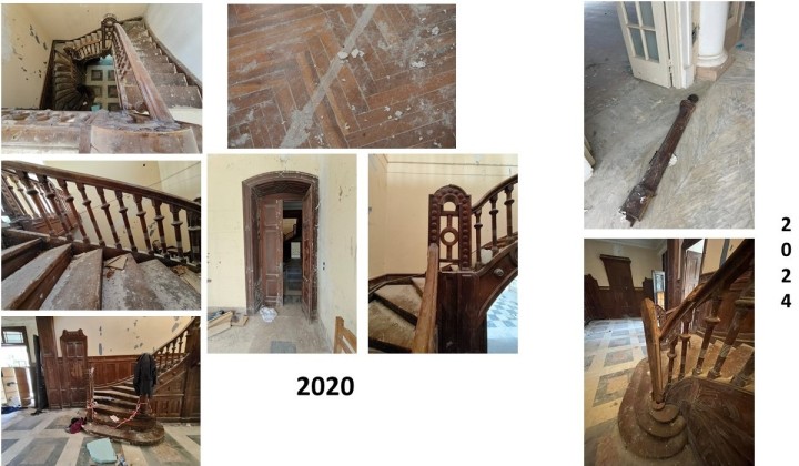 Φωτογραφίες έρχονται στο φως, που μαρτυρούν στο εσωτερικό της Έπαυλης καταστροφές στα περίτεχνα ξύλινα στηρίγματα, στα σκαλοπάτια, στις πόρτες, στα πατώματα τα ξύλινα και τα μαρμάρινα στα αρτ ντεκό μπάνια.