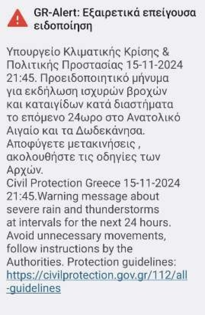 Μήνυμα μέσω του οποίοι προειδοποιεί για κακοκαιρία απέστειλε σε χιλιάδες ροδίτες και ροδίτισσες η Πολιτική Προστασία. Το μήνυμα κάνει λόγο για εκδήλωση ισχυρών βροχών και καταιγίδων κατά διαστήματα το επόμενο 24ωρο στο Ανατολικό Αιγαίο και τα Δωδεκάνησα και καλεί τον κόσμο να αποφύγει τις μετακινήσεις και να ακολουθεί τις οδηγίες των αρχών.