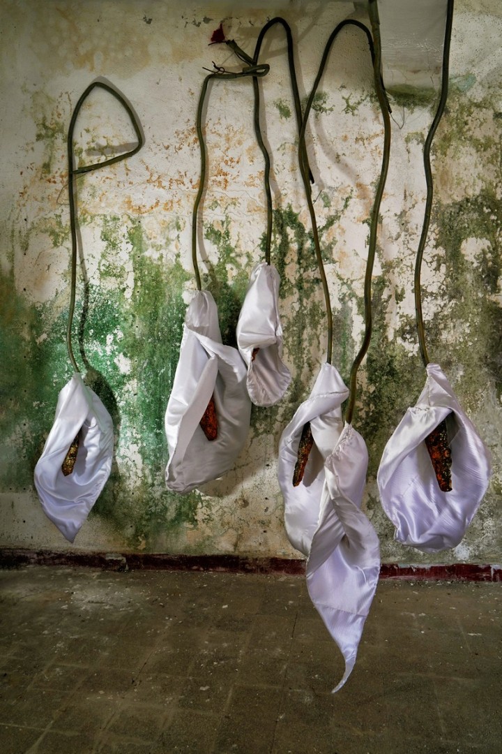 Τέλος, στην ενότητα με τους λευκούς κρίνους, η καλλιτέχνιδα αμφισβητεί τις αιωνόβιες συμβολικές και πολιτισμικές συνδηλώσεις που φέρει το λουλούδι σε σχέση με την γυναίκα, π.χ. μητρότητα, ομορφιά, αγνότητα και πνευματικότητα. Ευμεγέθεις κρίνοι κρεμιούνται ανάποδα, πιασμένοι από τα μακριά κοτσάνια τους, με τα σατέν πέταλα της γυναικείας φύσης, ντελικάτα και σεξουαλικά μαζί, να αντιπαρατίθενται με τους άτεγκτους, πυρωμένους μίσχους. Η θηλυκότητα επανανοηματοδοτείται κοντράροντας τους παραδοσιακούς κανόνες που απαιτούν τελειότητα ή αγνότητα και του ρόλου της γυναίκας ως κοινωνική κατασκευή, αφήνοντας χώρο στις αντίφαση, την ένταση, την αντίσταση και τη δυναμική της γυναικείας εμπειρίας.