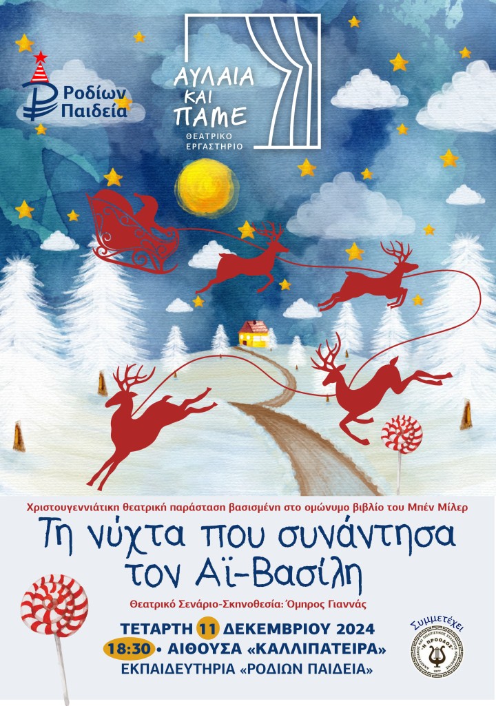 Τα Εκπαιδευτήρια «ΡΟΔΙΩΝ ΠΑΙΔΕΙΑ» και το Θεατρικό Εργαστήρι «ΑΥΛΑΙΑ ΚΑΙ ΠΑΜΕ» προσκαλούν το κοινό της Ρόδου σε μια μαγευτική Χριστουγεννιάτικη παράσταση με τίτλο «Τη νύχτα που συνάντησα τον Αϊ-Βασίλη», η οποία είναι βασισμένη στο ομώνυμο βιβλίο του Μπεν Μίλερ.