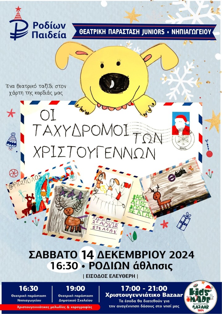 Τα παιδιά του Παιδικού Σταθμού και του Νηπιαγωγείου των Εκπαιδευτηρίων «Ροδίων Παιδεία», προσκαλούν μικρούς και μεγάλους να ζήσουν μια Χριστουγεννιάτικη περιπέτεια. Παραμονή Χριστουγέννων, ένα γράμμα κυλάει από το γραμματοκιβώτιο, δύο σκυλάκια αδέσποτα και μόνα στο κρύο το βλέπουν.