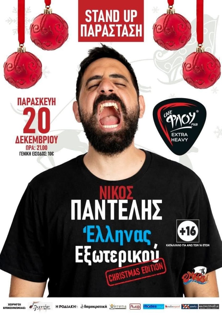 Ο Νίκος Παντελής έρχεται για μια stand up Christmas edition παράσταση στη Ρόδο, στις 20 Δεκεμβρίου στο Φλου Cafe.