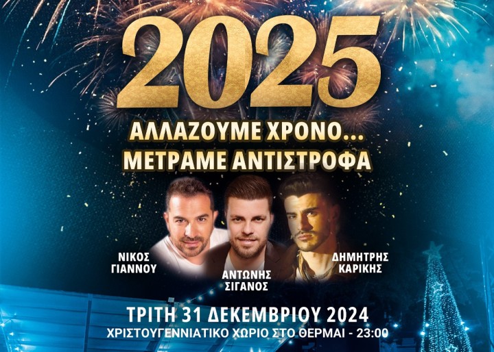 Την παραμονή της Πρωτοχρονιάς, ημέρα Τρίτη 31 Δεκεμβρίου, οι Ροδίτες θα υποδεχτούν το 2025 στο «Χριστουγεννιάτικο Χωριό» στο «Θέρμαι», συντροφιά με τους αγαπημένους Ρόδιους καλλιτέχνες Νίκο Γιάννου, Αντώνη Σιγανό και Δημήτρη Καρίκη, στις 11.00 το βράδυ.