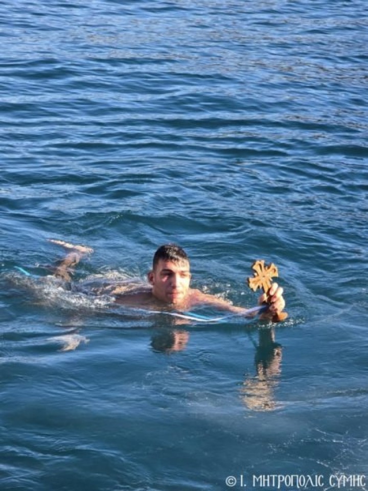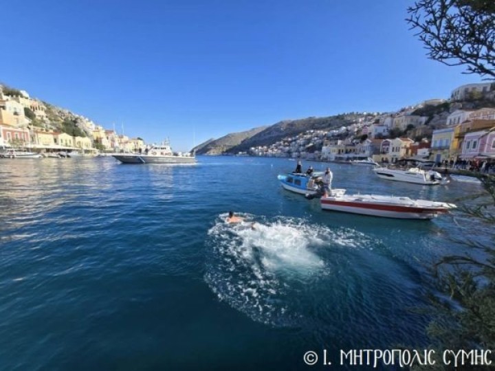 Ακολούθως ο Σεβασμιώτατος επικεφαλής του Ιερού Κλήρου, των τοπικών Αρχόντων και του πιστού λαού πορεύθηκε κατά το έθος στο γειτνιάζον γραφικό λιμάνι της Σύμης, όπου τέλεσε την κατάδυση του Τιμίου Σταυρού και τον καθαγιασμό των υδάτων. Πολλοί ήσαν οι τολμηροί που βούτηξαν στα παγωμένα νερά προκειμένου να ανασύρουν τον Τίμιο Σταυρό και να λάβουν την Θεία ευλογία στην ζωή τους. Τελικά εκείνος που τα κατάφερε ήταν ο κ. Ελευθέριος Φραζαδάκης, στον οποίο ο Μητροπολίτης προσέφερε ως ευλογία και ανάμνηση, χρυσό επιστήθιο σταυρό.