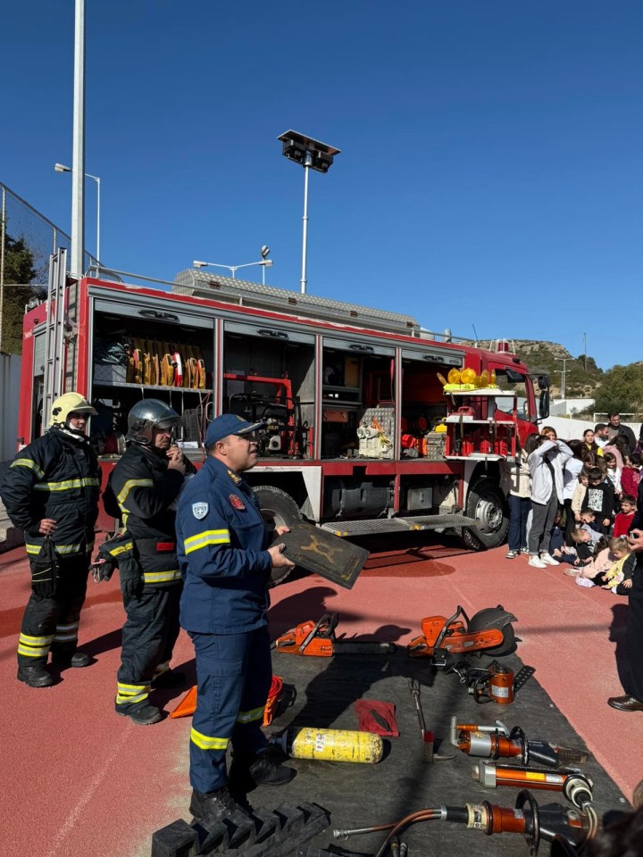 Ο κοι Παυλής και Κωστούδης μίλησαν στα παιδιά για τους κινδύνους από τον Σεισμό, για τις Πυρκαγιές, για τις Πλημμύρες και γενικότερα για τη σημαντική αποστολή της Πυροσβεστικής Υπηρεσίας.
