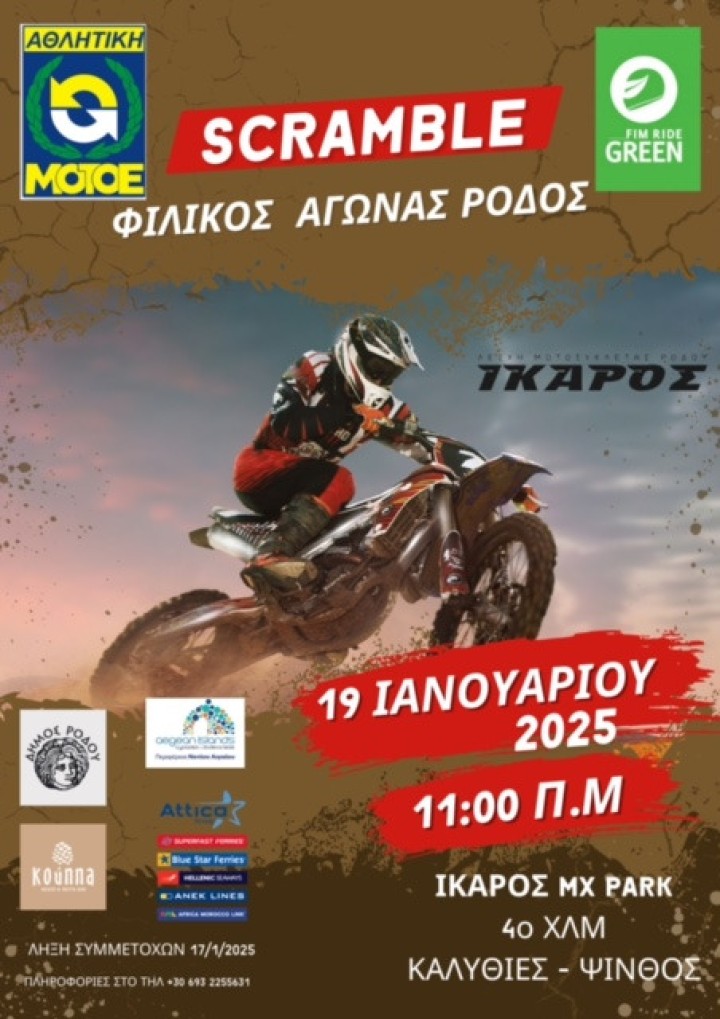 Η … εκκίνηση δίνεται αύριο Κυριακή, 19 Ιανουαρίου, με τον 1ο αγώνα τύπου “SCRAMBLE”, ο οποίος και θα λάβει χώρα στην πίστα του «ΙΚΑΡΟΣ MOTOCROSS PARK» στο 4ο χλμ. Καλυθιών - Ψίνθου στις 11 π.μ. Να σημειωθεί ότι είναι ο πρώτος επίσημος αγώνας του συλλόγου, καθώς και ο πρώτος για όλη την Ελλάδα με περισσότερες από 25 συμμετοχές αξιόλογων αναβατών, ενώ ακολουθεί το Κύπελλο ΜΟΤΟCROSS Νοτίου Αιγαίου που ξεκινάει στις 9 Φεβρουαρίου.