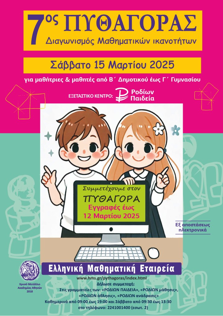- Ο 7οs Διαγωνισμός Μαθηματικών Ικανοτήτων ΠΥΘΑΓΟΡΑΣ θα διεξαχθεί το πρωί του Σαββάτου 15 Μαρτίου 2025 ηλεκτρονικά εξ αποστάσεως. Η διάρκειά του θα είναι 1 ώρα. Θα υπάρχει η δυνατότητα οι μαθητές/τριες να ακούσουν την εκφώνηση της άσκησης, εφόσον το επιθυμούν. Η ακριβής ώρα πραγματοποίησης του διαγωνισμού θα ανακοινωθεί μεταγενέστερα, διότι ενδέχεται για λόγους σταθερότητας και ασφάλειας του συστήματος μετάδοσης των θεμάτων να χρειαστεί η εξέταση να γίνει σε διαφορετικές ώρες ανά ομάδα τάξεων (υπάρχουν 6 ομάδες θεμάτων, αναγράφονται παρακάτω).