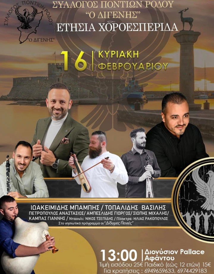 Ο δραστήριος Σύλλογος Ποντίων Ρόδου «Ο Διγενής», διοργανώνει τον ετήσιο χορό του και το γιορτάζει με ένα γνήσιο ποντιακό γλέντι την Κυριακή 16 Φεβρουαρίου 2025 και ώρα 13.00.