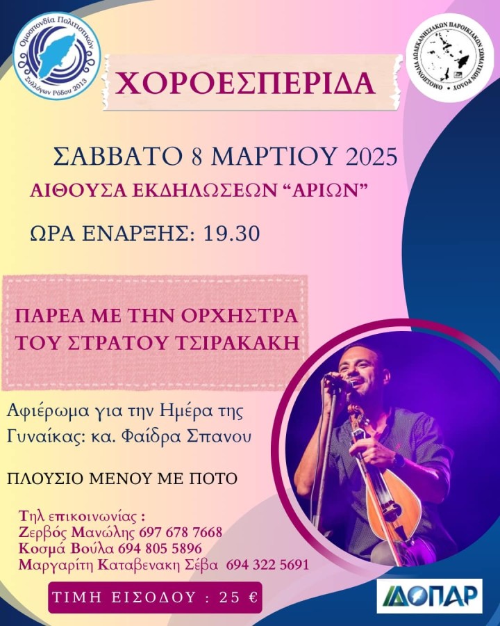 Χοροεσπερίδα θα πραγματοποιήσει η Ομοσπονδία Πολιτιστικών Συλλόγων Ρόδου το Σάββατο 8 Μαρτίου, με ώρα έναρξης 19:30 στην Αίθουσα Εκδηλώσεων «Αρίων».