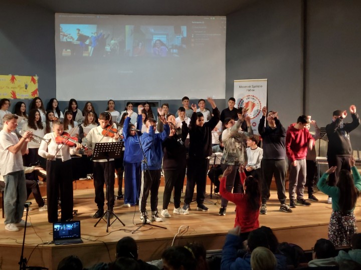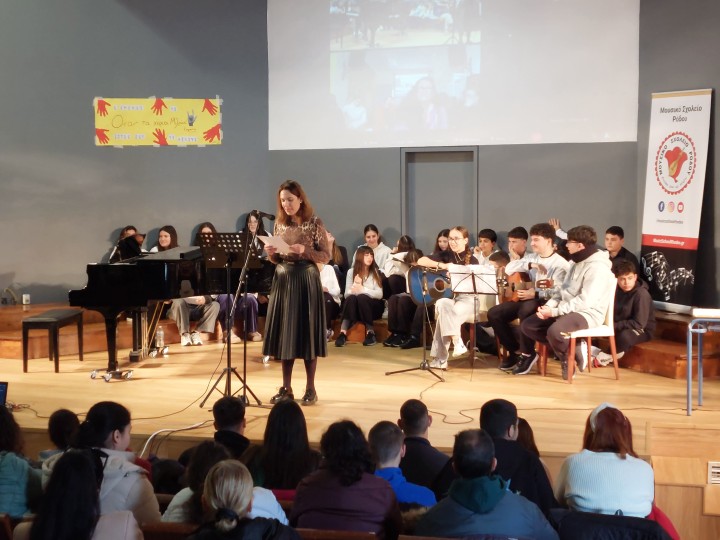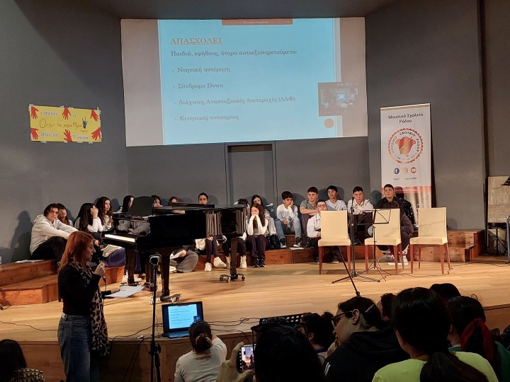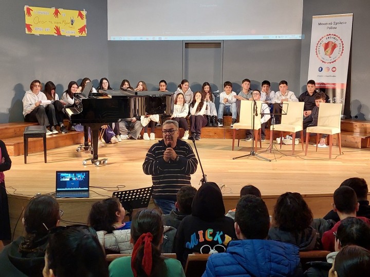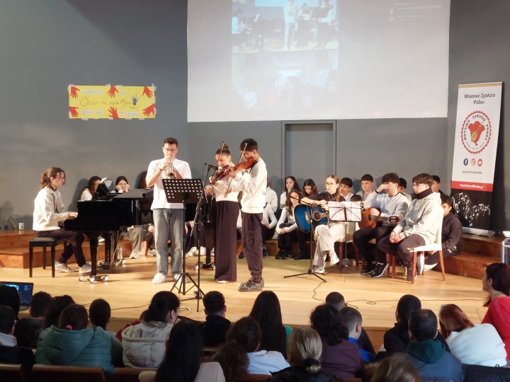 Οι μαθητές, οι μαθήτριες και οι εκπαιδευτικοί του Μουσικού Σχολείου Ρόδου, υποδέχθηκαν με μεγάλη χαρά στο αμφιθέατρο του Σχολείου τα παιδιά και τους/τις εκπαιδευτικούς των συνεργαζόμενων σχολείων. Κατά τη διάρκεια τις εκδήλωσης, τα παιδιά έπαιξαν μουσική, τραγούδησαν και συμμετείχαν σε βιωματικά παιχνίδια με καταπληκτική αλληλεπίδραση.
