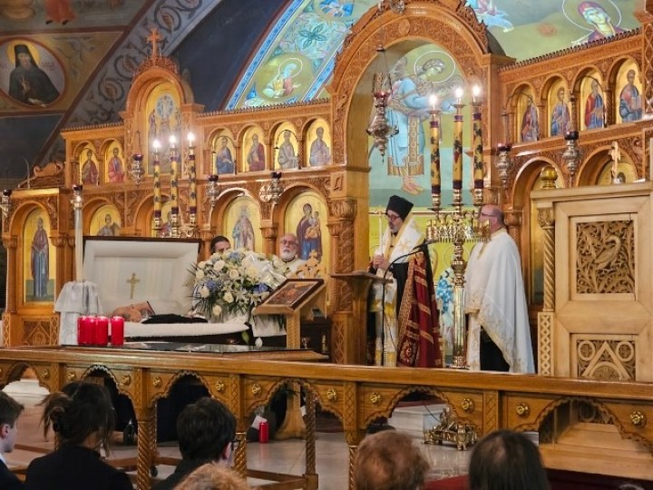 Ο Επίσκοπος Ναζιανζού, κ. Αθηναγόρας, ο οποίος προεξήρχε της Εξοδίου Ακολουθίας ανέγνωσε το συλλυπητήριο μήνυμα του Αρχιεπισκόπου Αμερικής, κ. Ελπιδοφόρου και εστίασε την προσφορά του αειμνήστου στην ελληνική παιδεία.