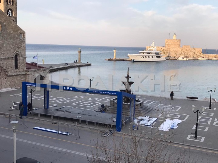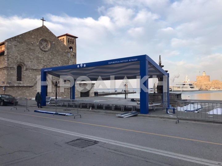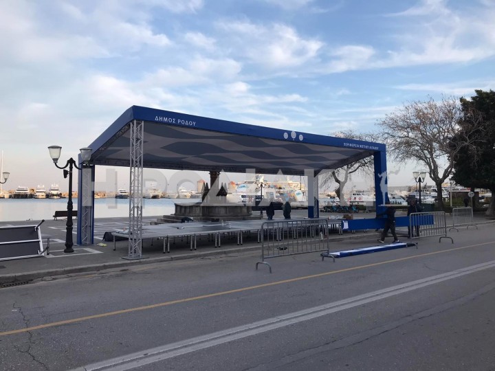 Νέου τύπου εξέδρα επισήμων στήθηκε πριν από λίγο από συνεργεία απέναντι από το ταχυδρομείο στην αυλή του Ευαγγελισμού, για την αυριανή παρέλαση. Πρόκειται για μια σιδερένια κατασκευή στην οποία κυριαρχεί το μπλέ χρώμα και μάλιστα στο σκέπαστρο της υπάρχει σχεδιασμένη μια κυματοειδής ελληνική σημαία. Στα αριστερά γράφει δήμος Ρόδου και στα δεξιά περιφέρεια Νοτίου Αιγαίου.