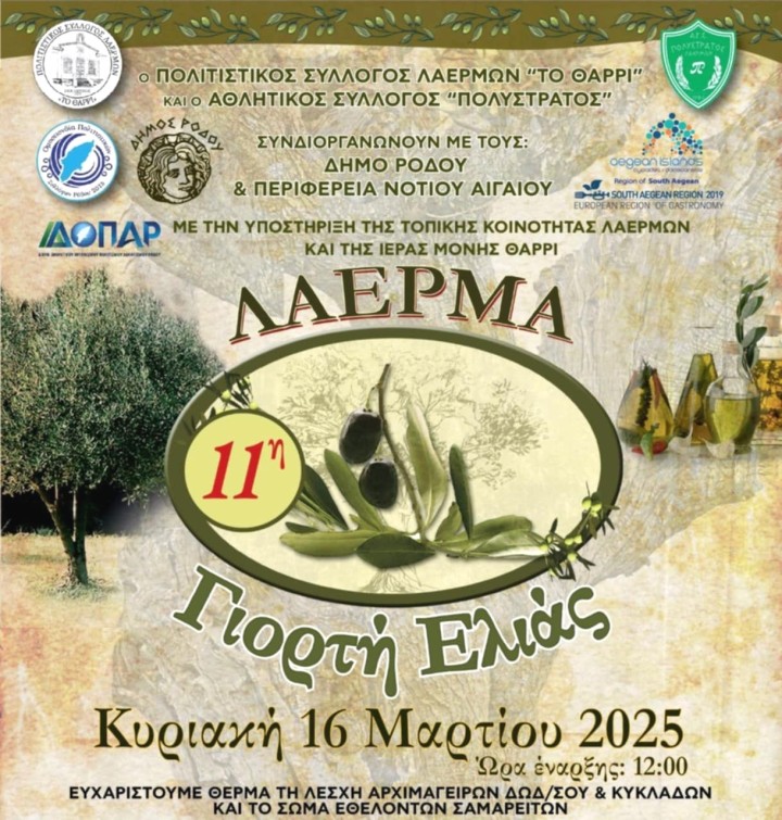 Την Κυριακή 16 Μαρτίου θα πραγματοποιηθεί η 11η Γιορτή Ελιάς στα Λάερμα από τον Πολιτιστικό Σύλλογο Λαέρμων «Το Θάρρι» και τον Αθλητικό Σύλλογο «Πολύστρατος», σε συνδιοργάνωση με τον δήμο Ρόδου και την περιφέρεια Νοτίου Αιγαίου, την Ομοσπονδία Πολιτιστικών Συλλόγων Ρόδου, με τη στήριξη της τοπικής Κοινότητας Λαέρμων και της Ιεράς Μονής Θάρρι.