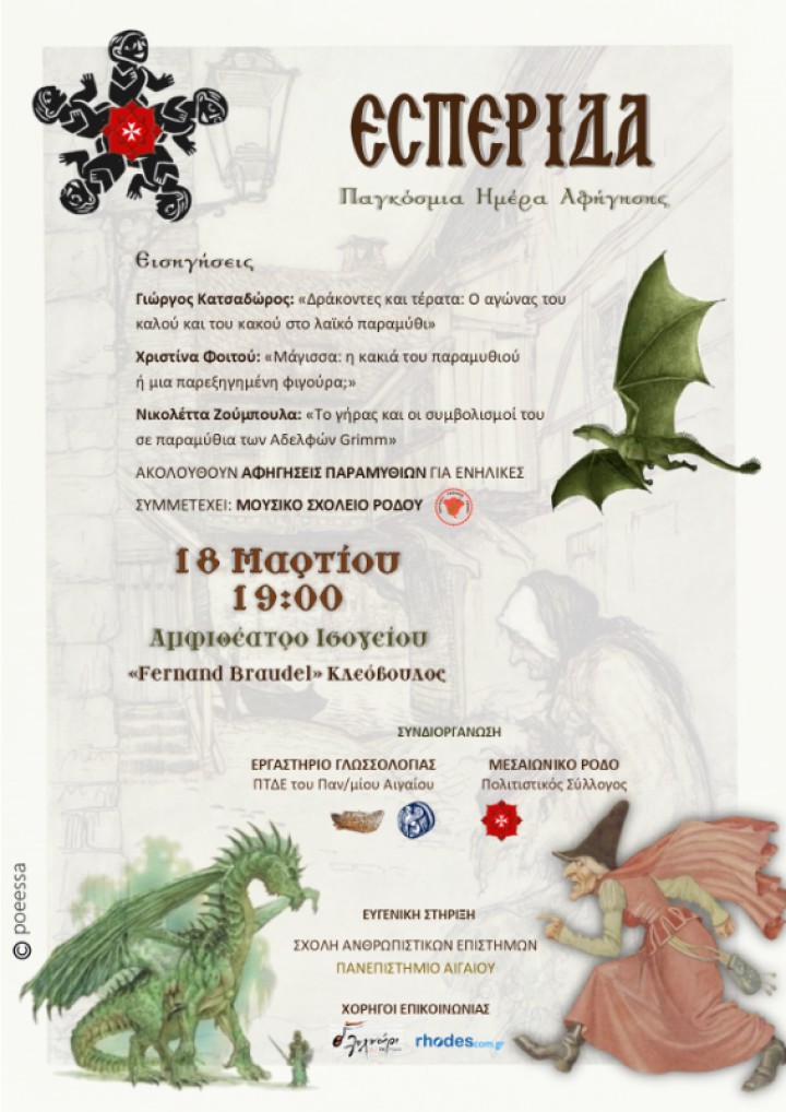 Εσπερίδα για την Παγκόσμια Ημέρα Αφήγησης και το λαϊκό παραμύθι θα πραγματοποιηθεί, με συνδιοργανωτές το Εργαστήριο Γλωσσολογίας του ΠΤΔΕ του Πανεπιστημίου Αιγαίου και τον Πολιτιστικό Σύλλογο «Μεσαιωνικό Ρόδο», ενόψει της Παγκόσμιας Ημέρας Αφήγησης και του Θερινού Ηλιοστασίου, που θα ταξιδέψουν το κοινό της Ρόδου στον κόσμο των παραμυθιών αλλά και στην πολυπολιτισμική Ρόδο του Μεσαίωνα!