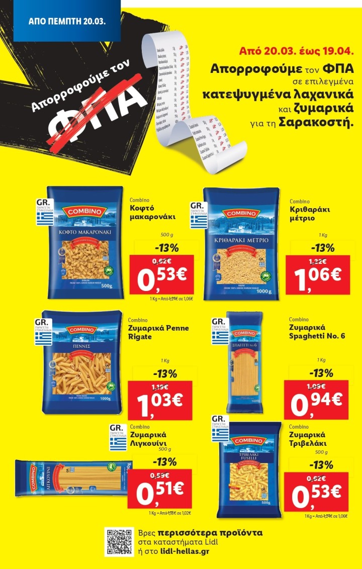 Για ακόμη μία φορά, η Lidl Ελλάς κάνει τη διαφορά, μειώνοντας το κόστος της καθημερινής διατροφής των καταναλωτών. Από τις 20 Μαρτίου έως τις 19 Απριλίου 2025, η εταιρεία προχωρά σε μια σημαντική πρωτοβουλία, απορροφώντας εξ ολοκλήρου τον ΦΠΑ σε επιλεγμένα κατεψυγμένα λαχανικά και ζυμαρικά, συμβάλλοντας έμπρακτα στη μείωση των εξόδων των νοικοκυριών σε αυτήν την απαιτητική οικονομικά περίοδο.