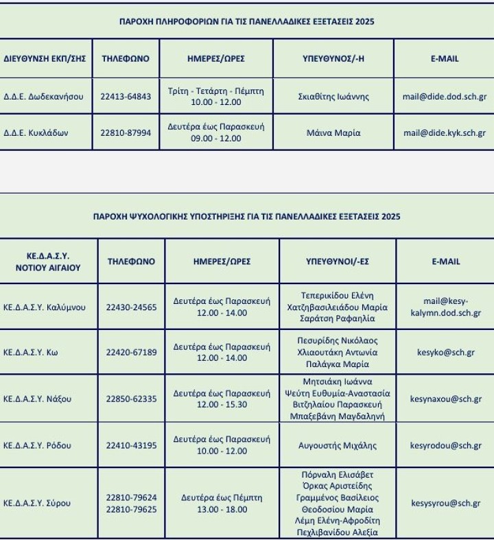 Η Περιφερειακή Διεύθυνση Πρωτοβάθμιας και Δευτεροβάθμιας Εκπαίδευσης Νοτίου Αιγαίου, με αίσθημα ευθύνης και αναγνωρίζοντας τις αυξημένες ανάγκες των υποψηφίων που συμμετέχουν στις Πανελλαδικές Εξετάσεις, ανακοινώνει τη λειτουργία τηλεφωνικών γραμμών για παροχή συμβουλευτικής υποστήριξης και ψυχολογικής ενίσχυσης στους/στις υποψηφίους/-ες των Πανελλαδικών Εξετάσεων 2025 και στις οικογένειές τους.