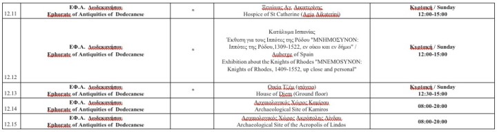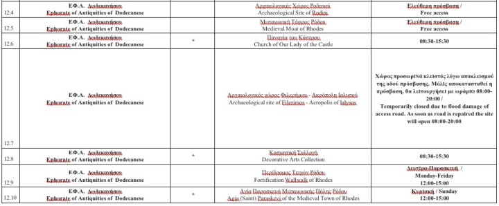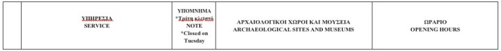 Διευκρινίζεται ότι, η προσέλευση των επισκεπτών επιτρέπεται έως και είκοσι (20’) λεπτά πριν τη λήξη του ωραρίου. Όλοι οι Αρχαιολογικοί Χώροι, τα Μνημεία και τα Μουσεία παραμένουν κλειστά την Κυριακή του Πάσχα και την Πρωτομαγιά, επίσημες αργίες του Κράτους. Τη Μεγάλη Παρασκευή λειτουργούν 12:00-17:00 και το Μεγάλο Σάββατο 08:30-15:30.