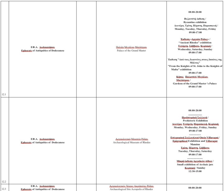 Στο σύνολο των Αρχαιολογικών Χώρων που εφαρμόζουν διευρυμένο ωράριο (08.00-20.00), καθώς και στα Μουσεία που λειτουργούν εντός αυτών, το ωράριο από 1η Σεπτεμβρίου 2025 διαμορφώνεται, λόγω σταδιακής μείωσης της διάρκειας της ημέρας, ως ακολούθως: 1η έως 15η Σεπτεμβρίου 08:00-19:30, 16η έως 30ή Σεπτεμβρίου 08:00-19:00, 1η έως 15η Οκτωβρίου 08:00-18:30 και 16η έως 31η Οκτωβρίου 08:00-18:00.