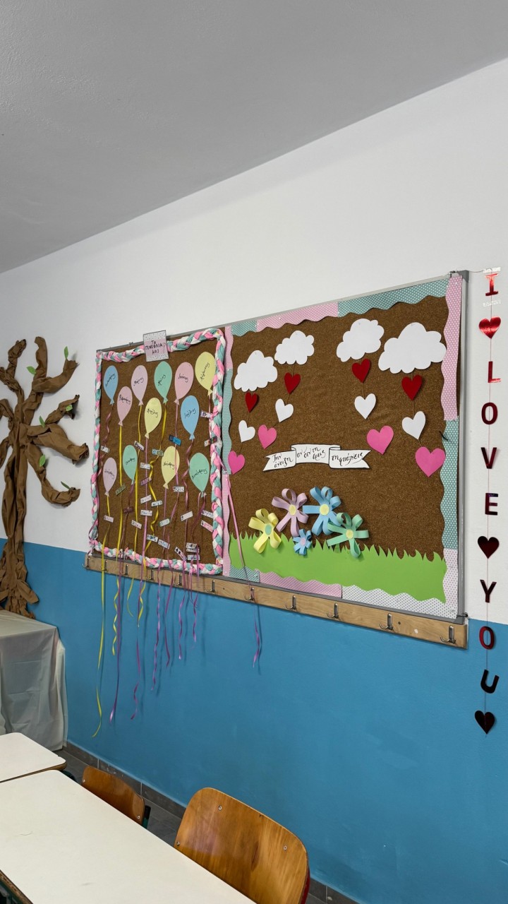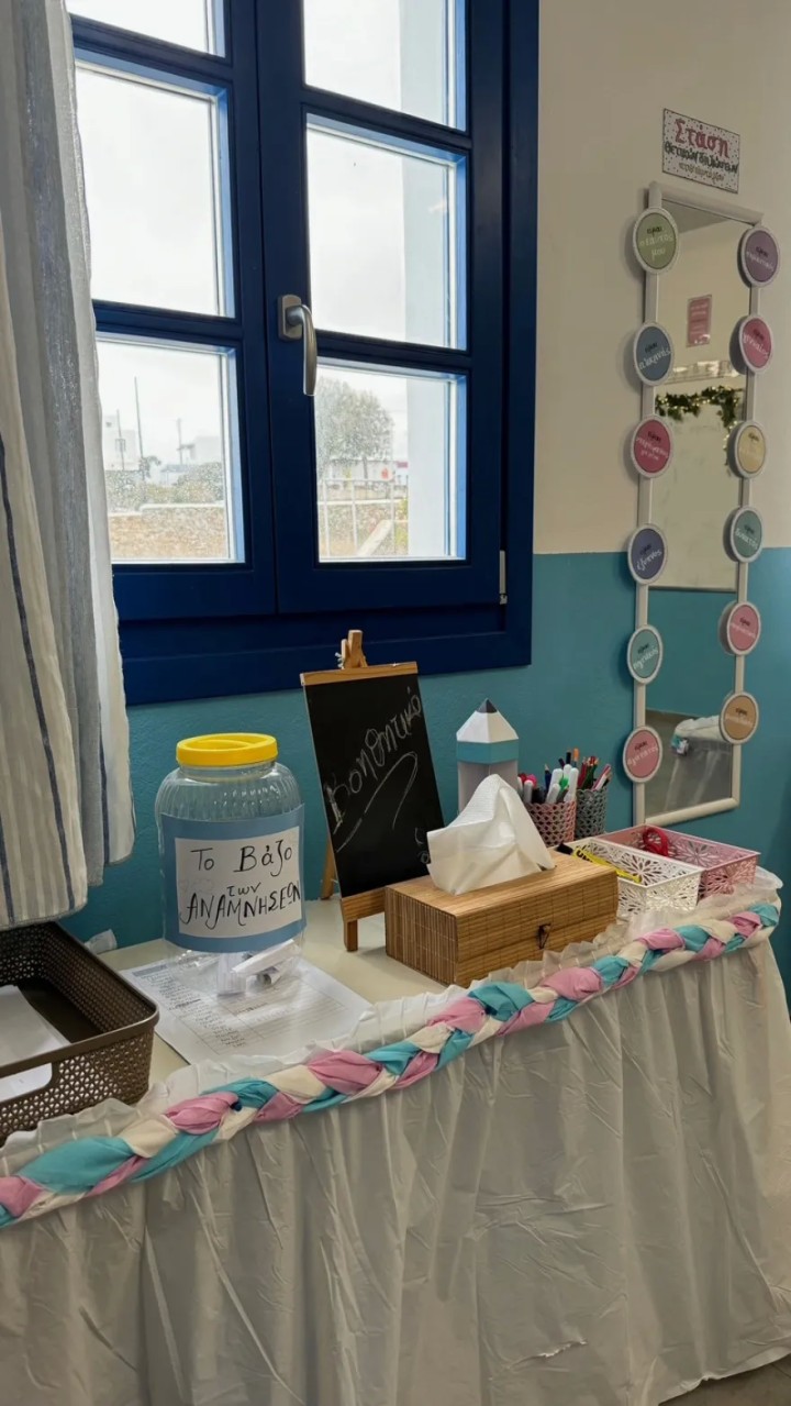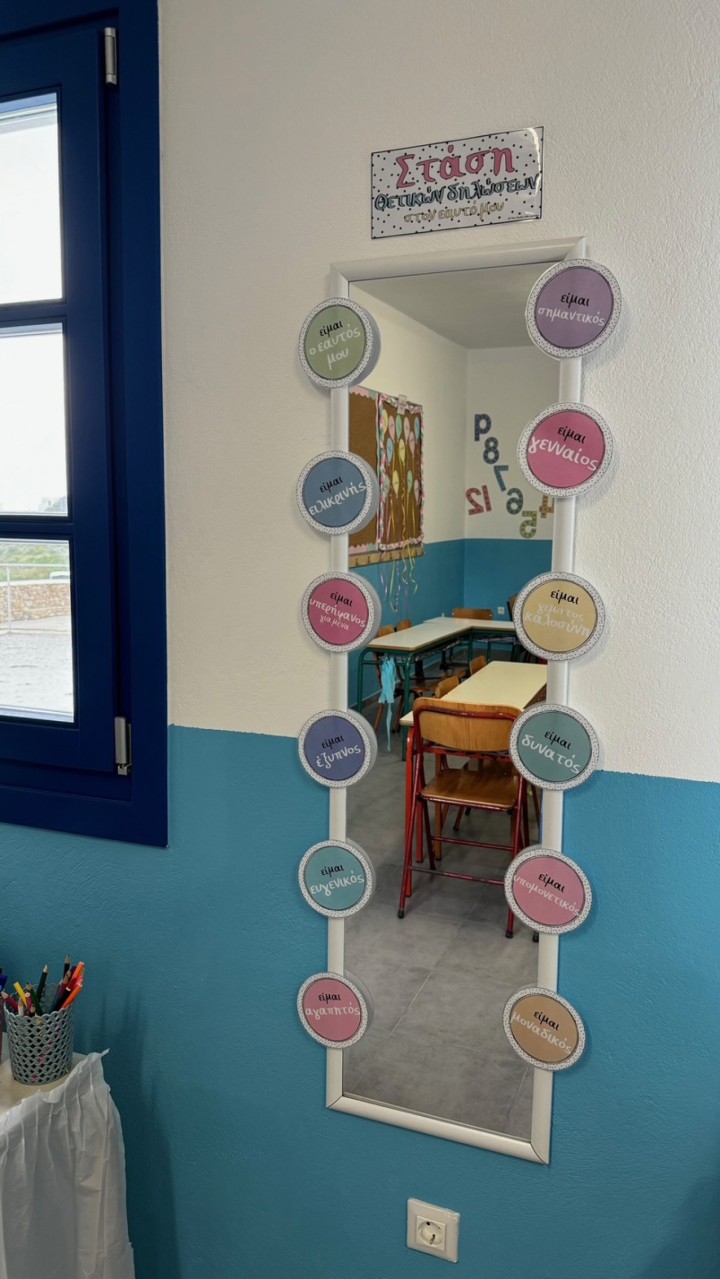 «Στον ένα τοίχο, υπάρχει καθρέπτης. Είναι η "Στάση θετικών δηλώσεων στον εαυτό μου" – πρόκειται για την εβδομαδιαία άσκηση, που κάνουμε με τα παιδιά και στοχεύει στην ενίσχυση της αυτοεκτίμησής τους καθώς βασίζεται στην αρχή, ότι ο εγκέφαλός μας καταγράφει και εκτελεί ό, τι λέμε. Αν και στην αρχή, ένιωθαν άβολα, πλέον έχουν μάθει και τον αντιμετωπίζουν με ωριμότητα. Θα σταθούν μπροστά να πουν ‘είμαι αγαπητός’, ‘είμαι σεβαστός’… », λέει η δασκάλα.