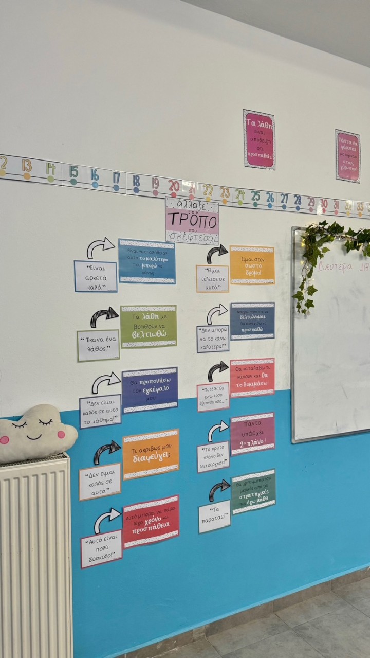 Μία άλλη θεματική γωνιά, είναι η «Άλλαξε τον τρόπο που σκέφτεσαι», βασισμένη στο βιβλίο της ψυχολόγου Κάρολ Ντουέκ (Carol Dweck) από το πανεπιστήμιο Στάνφορντ. «Αφού αφιερώσαμε τρεις διδακτικές ώρες σε συζητήσεις με τα παιδιά, αναρτήσαμε στην πλευρά αυτή σκέψεις δικές τους, όπως "αντί το ‘έκανα λάθος", "τα λάθη με βοηθούν να βελτιωθώ"."Ή αντί το ‘είμαι κακός στα μαθηματικά", "πρέπει να προσπαθήσω περισσότερο"… Το θετικό αποτύπωμα έχει αρχίσει πλέον και φαίνεται – τα παιδιά που έκλαιγαν στην αρχή όταν δεν τα πήγαιναν καλά σε ένα διαγώνισμα, έχουν καταλάβει πλέον ότι μία αποτυχία δεν τα καθορίζει. Έχουν ενστερνιστεί την άποψη ότι "τα λάθη μας, είναι οι οδηγοί μας"».