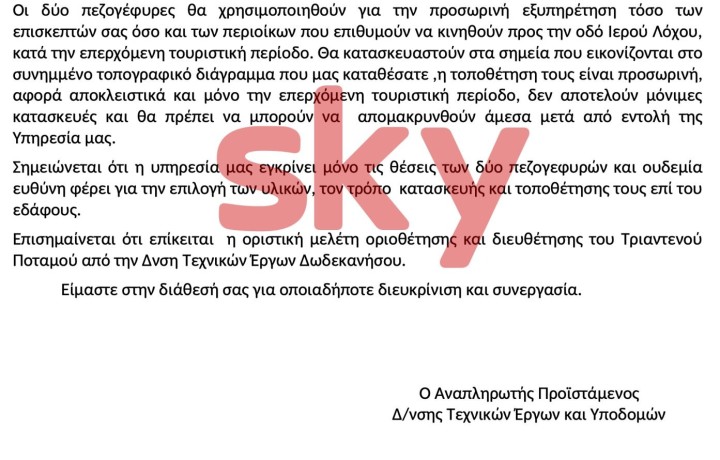 Τονίζεται πάντως πως το έργο της γέφυρας που τοποθετήθηκε έχει την έγκριση και τις προδιαγραφές που δόθηκαν από τις Τεχνικές Υπηρεσίες του Δήμου της Ρόδου.