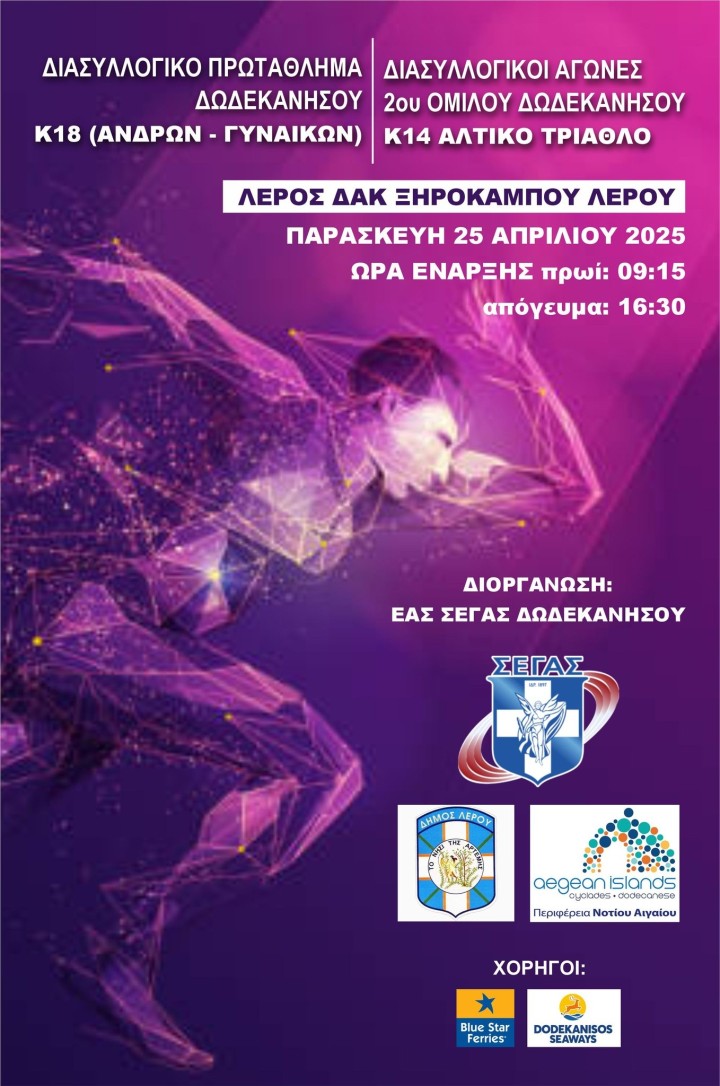 Την τιμητική τους θα έχουν οι αθλητές-αθλήτριες στίβου κατηγορίας Παίδων-Κορασίδων (Κ18) την Παρασκευή 25 Απριλίου, αφού στο στάδιο Ξηροκάμπου Λέρου θα διεξαχθεί το διασυλλογικό πρωτάθλημα από την ΕΑΣ Δωδεκανήσου με τη στήριξη του Δήμου Λέρου και της Περιφέρειας Νοτίου Αιγαίου.