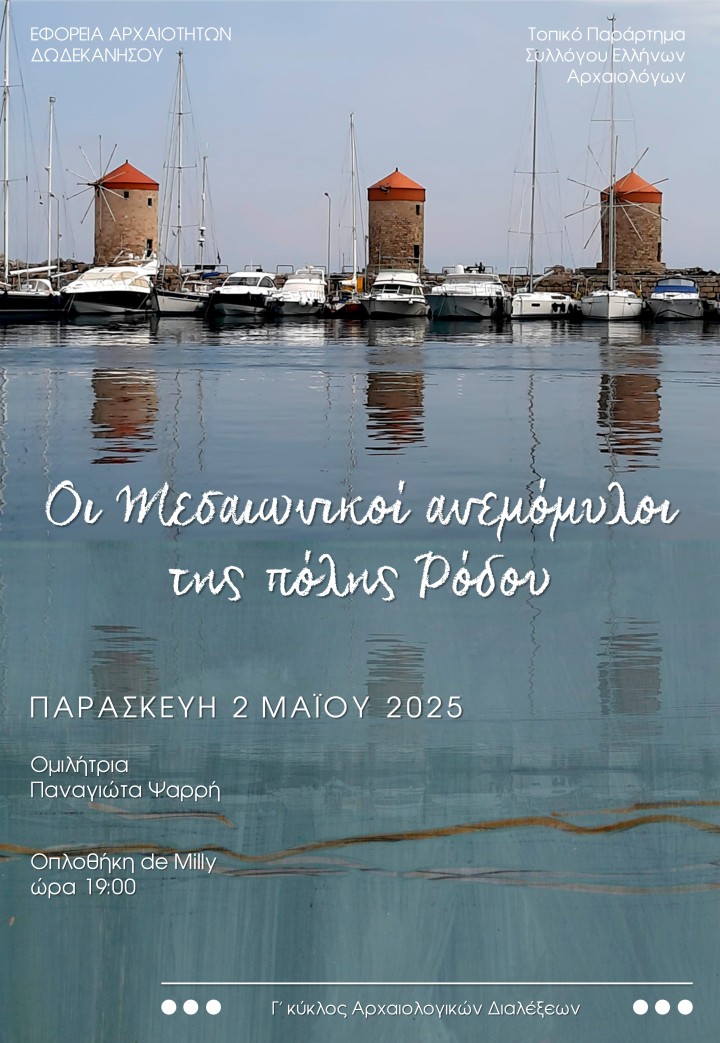 Την Παρασκευή 2 Μαΐου 2025 πρόκειται να πραγματοποιηθεί στην Οπλοθήκη de Milly, η ομιλία της αρχαιολόγου της Εφορείας Αρχαιοτήτων Δωδεκανήσου, κας Παναγιώτας Ψαρρή, με τίτλο «Οι μεσαιωνικοί ανεμόμυλοι της πόλης Ρόδου».