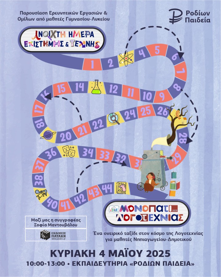 Τα Εκπαιδευτήρια «Ροδίων Παιδεία» διοργανώνουν και σας προσκαλούν στην «Ανοιχτή Ημέρα Επιστήμης και Τέχνης» και στο «Μονοπάτι της Λογοτεχνίας», που θα πραγματοποιηθούν την Κυριακή, 4 Μαΐου 2025 από τις 10:00 μέχρι τη 13:00 στις εγκαταστάσεις τους.