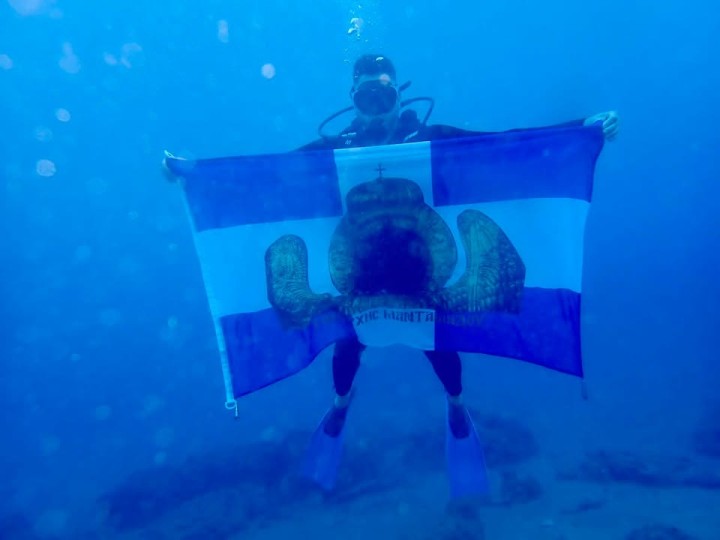 Σε μία άκρως συμβολική κίνηση προχώρησε ο δύτης Τάσος Βασιλείου, ο οποίος βούτηξε στα ελληνικά νερά, και συγκεκριμένα στη θάλασσα του Λαδικού, κρατώντας την ελληνική σημαία.