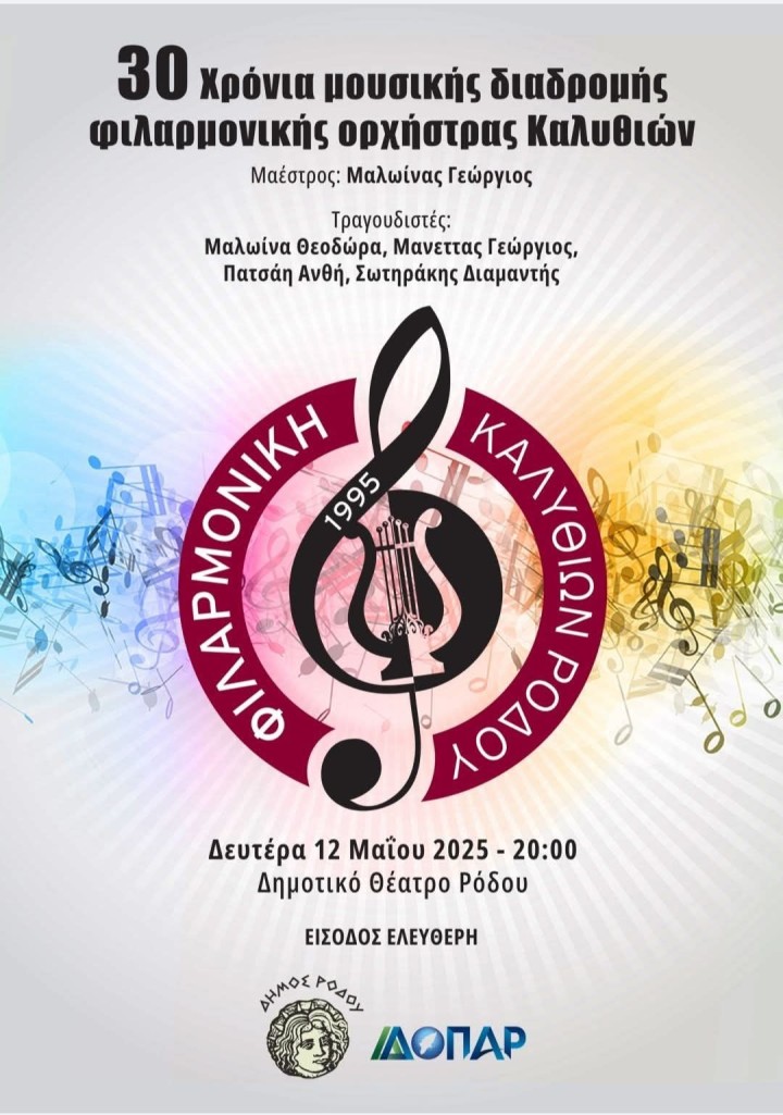 Η Φιλαρμονική Καλυθιών «κλείνει» φέτος τριάντα χρόνια ύπαρξης και αμείωτης δραστηριότητας στον δύσκολο στίβο της συμφωνικής μουσικής, και το γιορτάζει διοργανώνοντας μία ξεχωριστή συναυλία τη Δευτέρα 12 Μαΐου 2025, στο Δημοτικό Θέατρο Ρόδου και ώρα 20.00 (ελεύθερη είσοδος).