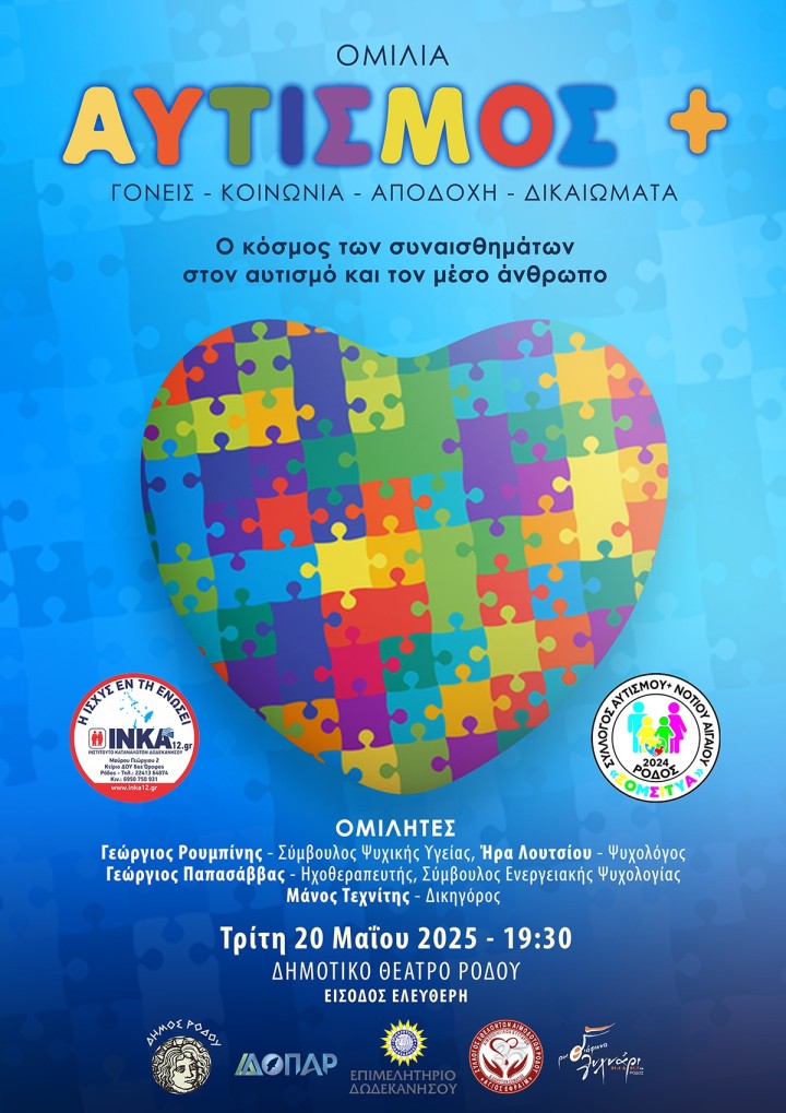 Το Ινστιτούτο Προστασίας Καταναλωτών ΙΝΚΑ12, σε συνεργασία με τον Σύλλογο Γονέων, Φίλων και Ατόμων στο Φάσμα του Αυτισμού ΣΟΜΣΙΤΥΑ, τον δήμο Ρόδου και τη Διεύθυνση ΔΟΠΑΡ, προσκαλούν το κοινό της Ρόδου στην ομιλία με θέμα: «Ο κόσμος των συναισθημάτων στον Αυτισμό και στον μέσο άνθρωπο» (ΓΟΝΕΙΣ – ΚΟΙΝΩΝΙΑ – ΑΠΟΔΟΧΗ – ΔΙΚΑΙΩΜΑΤΑ).