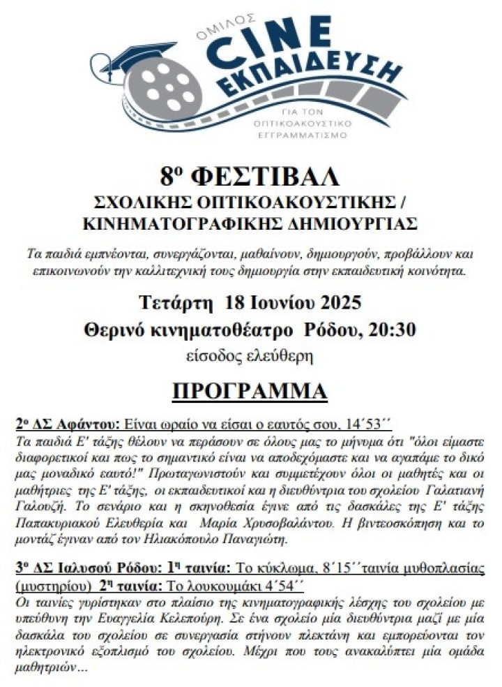 Σήμερα στο «Ρόδον» το 8ο Φεστιβάλ Σχολικής Οπτικοακουστικής/Κινηματογραφικής Δημιουργίας