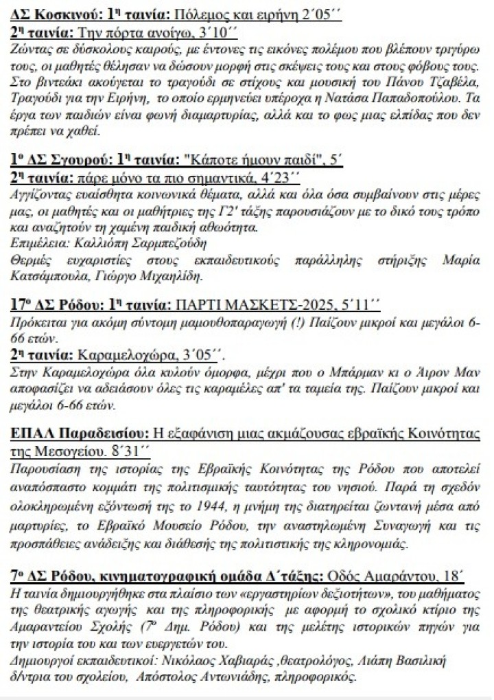 Στη φετινή γιορτή της σχολικής μαθητικής οπτικοακουστικής δημιουργίας συμμετέχουν 12 κινηματογραφικές ομάδες σχολείων όλων των βαθμίδων από το νησί της Ρόδου και το ακριτικό Αγαθονήσι, καθώς και το Κέντρο Περιβαλλοντικής Εκπαίδευσης και Αειφορίας Πεταλούδων (ΚΕ.ΠΕ.Α.) με δύο πολύ ενδιαφέροντα εκπαιδευτικά βίντεο.