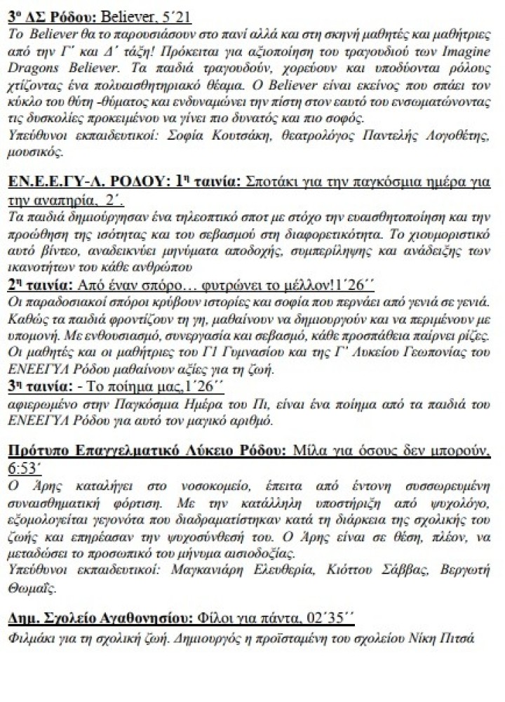 Συνολικά, θα προβληθούν 19 φιλμάκια οπτικοακουστικής δημιουργίας (ταινίες μικρού μήκους μυθοπλασίας, ντοκιμαντέρ, εκπαιδευτικά βίντεο, μουσικά σποτάκια κ.ά.), δημιουργικές καλλιτεχνικές ομαδικές δραστηριότητες εμπνευσμένες από κάθε πτυχή της σχολικής και κοινωνικής ζωής, όπως φαίνεται στο επισυναπτόμενο πρόγραμμα.