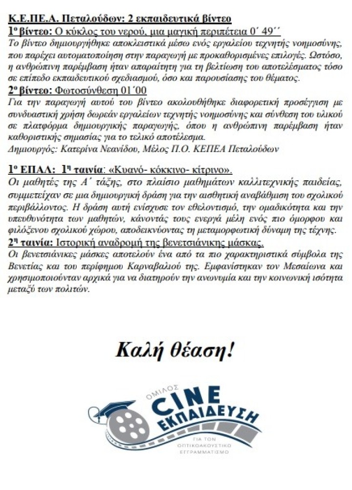 Πριν τις προβολές, οι δημιουργοί, μαθητές/μαθήτριες και εκπαιδευτικοί, θα παρουσιάσουν με λίγα λόγια την ομαδική τους δημιουργία.