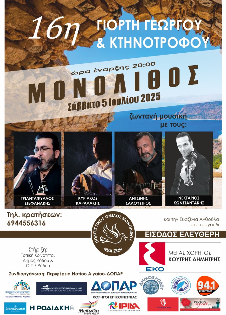 Ο Πολιτιστικός Όμιλος Μονολίθου «Νέα Ζωή», με τη στήριξη της Τοπικής Κοινότητας Μονολίθου, του δήμου Ρόδου και του Ο.Π.Σ. Ρόδου, και σε συνδιοργάνωση με την περιφέρεια Νοτίου Αιγαίου και τον Δημοτικό Οργανισμό Πολιτισμού Αθλητισμού Ρόδου (ΔΟΠΑΡ), διοργανώνει τη 16η Γιορτή Γεωργού και Κτηνοτρόφου, το Σάββατο 5 Ιουλίου 2025 στη Μονόλιθο της Ρόδου.