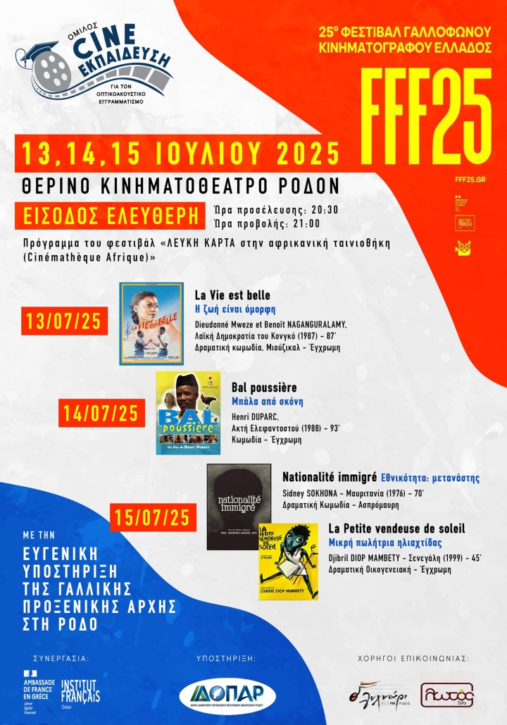 Για πέμπτη συνεχή χρονιά, το Φεστιβάλ Γαλλόφωνου Κινηματογράφου Ελλάδος φέρνει στη Ρόδο τον παλμό και τη γοητεία της γαλλόφωνης κινηματογραφικής τέχνης, σε μια μοναδική τριήμερη προβολή στο Θερινό Κινηματοθέατρο «Ρόδον».