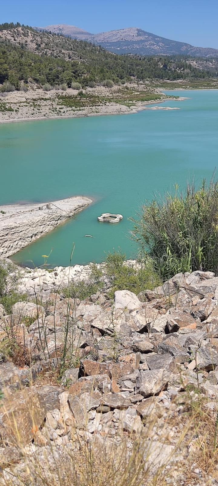 Οι φωτογραφίες-ντοκουμέντο δείχνουν εμφανή τα φρεάτια υδροληψίας, γεγονός που αποδεικνύει την έλλειψη νερού και παραπέμπει σύντομα σε διακοπή υδροδότησης για τις αρδευτικές εκτάσεις της περιοχής.