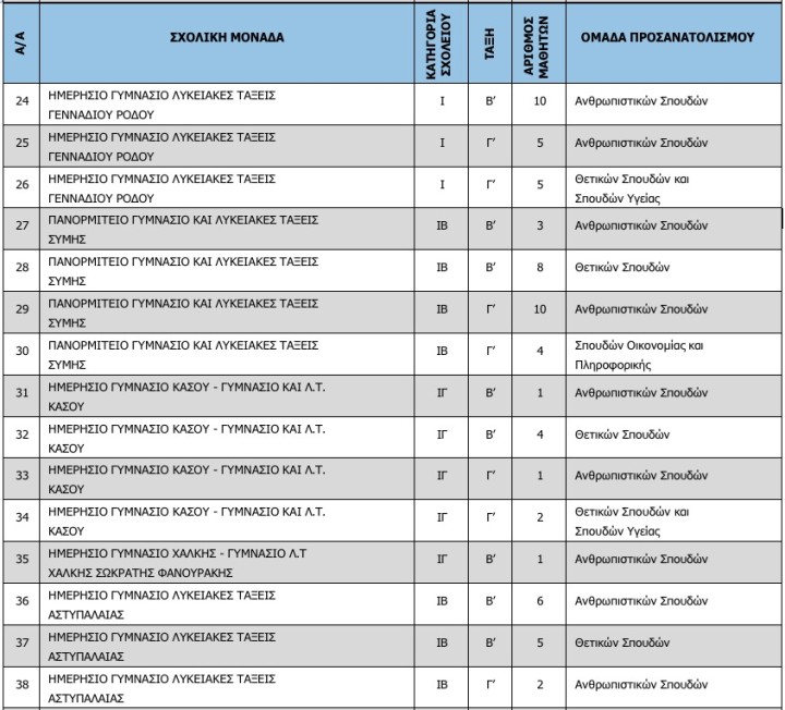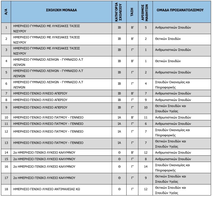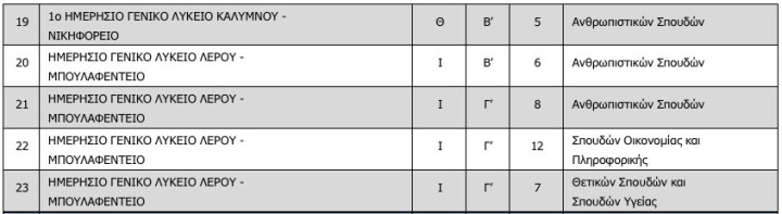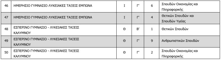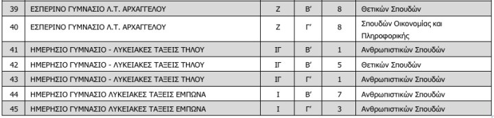 Τα τμήματα και οι σχολικές μονάδες σύμφωνα με την απόφαση είναι οι εξής: